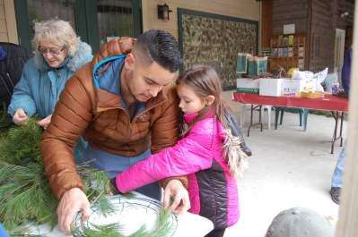 Izaa Rodriguez helps as his daughter Izabella begins a wreath.