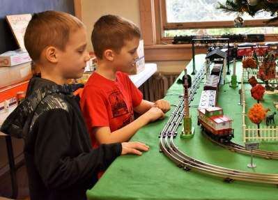 Chase and Shane Coleman, of Bethlehem, watch the trains roll along the tracks Sunday at a holiday model railroad display, built by Explorer Scouts of Model Railroad Explorer Post 101 and open to the public at Coplay Borough Hall, 98 S. Fourth St.PRESS PHOTOS BY TINAMARIE MARTIN