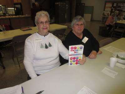 PRESS PHOTOS BY ANITA HIRSCHSpeaker and poet Shirley Benz Binkley holds her book “One Size Fits All” at the Jan. 3 AARP meeting at St. Timothy's Church, Allentown. Her friend Joan Wrona sits next to her.