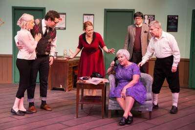 The “Moon Over Buffalo” set looked suspiciously like the one for the Playhouse’s production of “The Fox on the Fairway,” only the backstage green room with its five doors really was painted green.