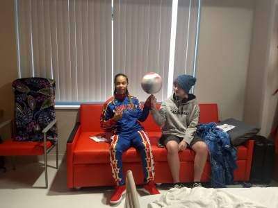 Briana “Hoops” Green, a member of the exhibition basketball team, the Harlem Globetrotters, stopped by Lehigh Valley Reilly Children's Hospital Feb. 11 as part of the team's Smile Patrol program. “Hoops” visited with Porter Lilley, of Fogelsville. Green plays guard, according to the team website and joined the team in 2017.PRESS PHOTO COURTESY LVH