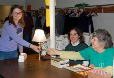 PRESS PHOTOS BY DONALD WENNERUCC Greenawalds, South Whitehall, sponsored its 11th annual penny party Feb. 23. There was a light supper and then bidding began at 6 p.m. Church members and friends bid on items as each tray passed their way. Items included food, puzzles, games, jewelry, candles, pottery and more. Madison Peters of Emmaus purchases boxes of numbers from Sherri Ruch and Diane Borman.