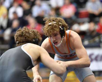 Julian Chlebove started his march toward his third state title by being named the AAA tournament’s Most Outstanding Wrestler. He won his third district title in style by pinning nationally-ranked Kenny Herrmann of Beca in 4:58. The future Arizona State Sun Devil has a bye into the quarterfinals at 132.