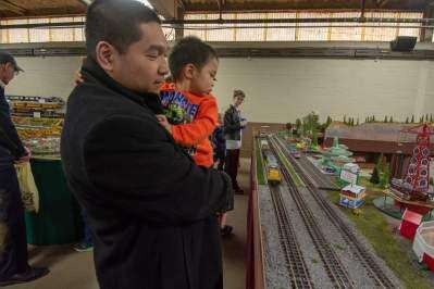 PRESS PHOTOS BY LOU WHEELANDBreinigsville's Dung Tran and son, George, 3, watch the large train display at the annual ATMA Spring Thaw Train Meet. Copyright - Lou Wheeland Photography