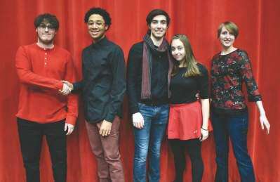 The Lehigh Valley Charter High School for the Arts' “Sweeney Todd” cast includes, from left, Michael Scuotto (Beadle Bamford), Derrick Sanders (Judge Turpin), Jayden Browne (Sweeney Todd), Chloe McCarty (Mrs. Lovett) and Rebecca Ripley (Johanna). Copyright - &Copy; Ed Courrier