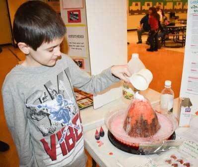 At Sheckler Elementary School's fourth-grade science fair March 6, Patrick Leeper, of Catasauqua, shows how he can make his volcano erupt by using baking soda and vinegar. Patrick used dough to make the body of the volcano. βIt took me two weeks to make my project,β he said.