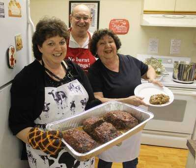 Judy Morgan, Larry Braker and Judy Corrocher-Bastian show off the simmering meatloaf fresh from the kitchen during a meatloaf dinner March 2 at Salem United Church of Christ, 615 Third St., Catasauqua.Press photos by Paul Cmil