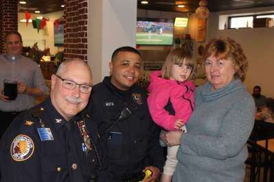 PRESS PHOTOS BY PAUL CMILLeft: Jaylyn Robinson gets some attention from Catasauqua Police Chief Douglas Kish, Officer Joelle Mota and Mayor Barbara Schlegel at the Pizza with Police event, held March 28 at Pie's On Pizzeria, 102 Pine St.