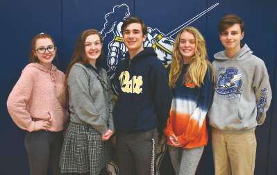 Notre Dame High School's “Thoroughly Modern Millie” cast includes, from left, Evie Carlin (Muzzy Van Hossmere), Harper Hogan (Millie), Sam Durigon (Jimmy), Larsen Lencheski (Miss Dorothy) and Jayson Gunkle (Trevor Grayden). Copyright - &Copy; Ed Courrier