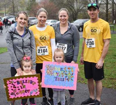 Karisa, Rowan and Adam Terpay, of Schnecksville, join Ella and Kim Visnar, of New Tripoli, and Karly Miller, of Bangor, for the 10th annual Ready, Set, GO(LD) 5K walk, 8K run and kids' fun run April 13 along the Ironton Rail Trail.