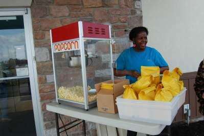 Denise Kalisz bags popcorn to have with lunch after the Easter Egg Hunt.