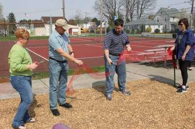 PRESS PHOTOS BY PAUL CMILNorth Catasauqua officials Councilwoman Cherie Gebhardt, Mayor William Molchany and council President Peter Paone cut the ribbon, held by Barbara Sukanich, at the April 18 opening of the upgraded Tot Lot at North Catasauqua William J. Albert Memorial Park, 701 Grove St.
