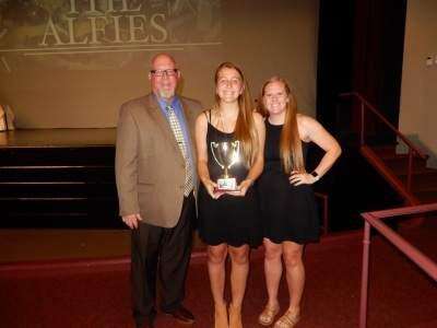 PRESS PHOTO COURTESY kriz familyShannon Kriz holds her John E. Blood award. Kriz' soccer coaches stand at either side of her at the Juniata College ceremony.