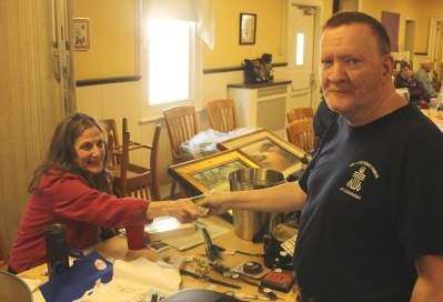 Left, top: Jean Decker scores a sale with Tim Meyer at Presbyterian Church of Catasauqua's craft/vendor fair April 6.