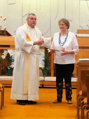Rev. Richard H. Elliott, Sr. Pastor of The Lutheran Church of the Holy Spirit, Emmaus presents Alice Mudge, longtime executive administrative assistant, with a monetary gift on behalf of the council and congregation on her retirement. “It is not ‘farewell' as she will continue to be an active volunteer,” Elliott said.