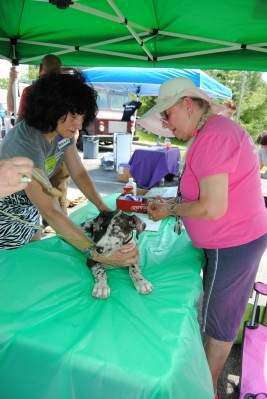 PRESS PHOTOS BY SUSAN BRYANTWendy Karopoulos, manager at Howard Hanna The Frederick Group, holds her 10-week-old Great Dane Bella while she gets microchipped by Mary Stetzel, retired vet tech and volunteer with Sanctuary at Haafsville. The festival was sponsored by Howard Hanna The Frederick Group and The Sanctuary at Haafsville, Breinigsville.