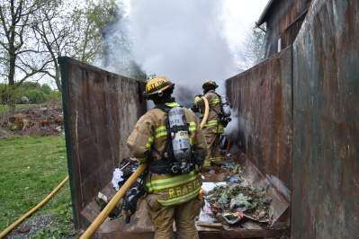 PRESS PHOTO BY JIM MARSHWestern Salisbury Fire Department firefighters responded to a Lehigh County 911 Center dispatch for an outside fire behind a commercial barn structure at 3350 Devonshire Road about 4:30 p.m. May 1. ABOVE: Firefighters James Caliendo and Lt. Ryan Basta make quick work of extinguishing the small trash fire in a dumpster behind the barn.