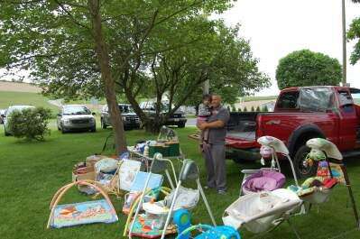 At the sale Tweet Published May 30. 2019 12:00AM by The Press Sara Mahmoud, held by her father, Mohammed, looks at all the baby items her family offered for sale at the Weisenberg Lowhill Township Historical Society yard sale at Werleys Corner.