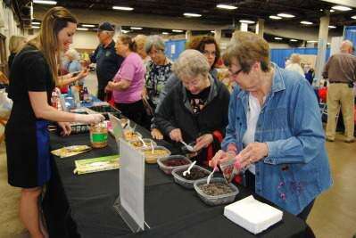 Donna Sommer of South Whitehall and Carole Rohrbach of Lower Macungie fill a small baggies with nuts, chocolate chips and dried fruits from Weis Markets at the senior expo May 16 at the Agri-Plex at the Allentown Fairgrounds. Watching is Weis Dietitian Lyndi Wieand, RDN, LDN. The expo was presented by Lehigh Valley Aging in Place.PRESS PHOTOS BY SUSAN BRYANT