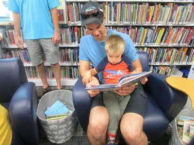 Chris Biehl reads the book “Nebraska,” to son, Kodiak, in anticipation of the dads and doughnuts story time June 15 at Parkland Community Library, South Whitehall.PRESS PHOTOS BY ANITA HIRSCH