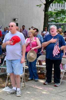 ‘Step up and be heard’ Tweet Published July 08. 2019 12:00AM by The Press PRESS PHOTOS BY DANA GRUBBArea residents recite the Pledge of Allegiance at the start of the annual reading of the Declaration of Independence at Payrow Plaza on Independence Day.