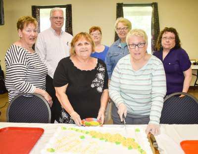 PRESS PHOTOS BY TINAMARIE MARTINBoard members Chris Mack, Eleanor Snyder, Dianne Bartholomew, Ellie Shumack, Rosie Kromer, Barbara Brown and Jeffrey Dutt start to cut the cake May 2 during the anniversary celebration of Whitehall Active Lifestyle Center, 2301 Pine St., West Catasauqua.