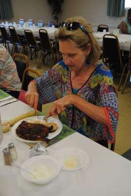 Dawn Scherr of South Whitehall cuts her baked potato at the NOVA Ladies Auxiliary barbecued chicken dinner July 20 at the headquarters in Ormrod. The dinner was a fundraiser for Northern Valley Emergency Medical Services.PRESS PHOTOS BY SUSAN BRYANT