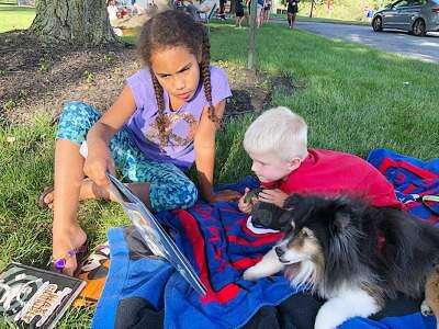 PRESS PHOTO COURTESY KAREN CSENCSITSDaya Williams of Neffs, a student at Schnecksville Elementary School, reads to Landon Csencsits, 4, and Casey, a 14-year-old Shetland sheepdog, at the recent Read to the Pups event at Parkland Community Library, South Whitehall.