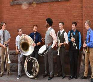 The ensemble includes Connor Devlin, sousaphone; Vincent Shickora, Ben Ewing, Nolan Wible, trumpets; Dominic Mascaro, trombone; Sam Yoder, trombone and guitar; Nick Franks and Paul Berry, saxophones, and Matt Woodson, drums.