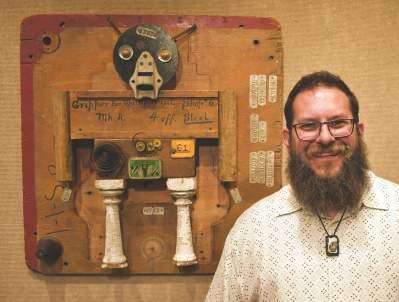 PRESS PHOTO BY ED COURRIERBaum School of Art's artist-in-residence Mark May with his assemblage “MKA Gripp No. 6.” The artist and educator creates representations of robots and other sculpture with blocks of wood, sand-casting forms and found materials. May's “Assembly Required” exhibit in the David E. Rodale Gallery concluded Aug. 8. Copyright - &Copy; Ed Courrier