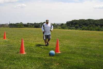 Joe Howard of the Upper Macungie Township road crew works to put a ball into a container with a leaf blower Aug. 2 during the Equipment Rodeo at the 103rd annual convention of the Lehigh County Association of Township Officials at the Schnecksville Fire Company.