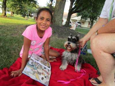 PRESS PHOTO BY ANITA HIRSCHDaya Williams of Neffs reads “Lost in New York City” to Leyna, a miniature schnauzer owned by Sandi Herman during the July 29 Read to the Pups program at Parkland Community Library, South Whitehall. Additional photos on page A7.
