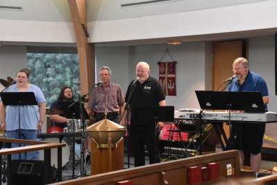 Press photo by Jim MarshSaturday Night Alive, the praise band from the Steel City Mennonite Church, in Hellertown, opens the Wednesday evening service at St. Timothy Evangelical Lutheran Church, 140 S. Ott St., Allentown, Aug. 7. Saturday Night Alive was the ninth guest praise band to appear at the church during its 10-week Wednesday night summer service series.