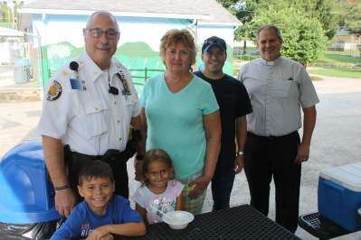 Barry Stockwell and his children Nicholas and Madison enjoy ice cream with Catasauqua Police Chief Douglas Kish, Catasauqua Mayor Barbara Schlegel and Holy Trinity Memorial Lutheran Church Pastor Brian Riedy at a Meet the Heat police-community gathering, held Aug. 15 at Catasauqua Park and Playground, 501 American St. Holy Trinity Memorial Lutheran Church sponsors the events, which take place