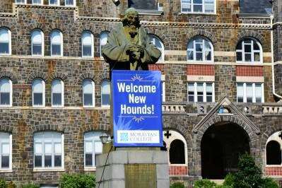 Press photo by Dana GrubbStudents are returning to the Moravian College campuses with festive balloons and banners welcoming the 416 member incoming freshmen class. Members of the Class of 2223 come from 213 high schools, 13 states and seven countries according to the college. Above: A banner welcoming the incoming Class of 2223 at Moravian College hangs from the campus statue of John Amos