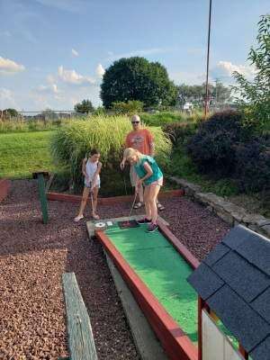 Contributed photoApril Engle, a member of Girl Scout Troop 6138 in Catasauqua, takes her turn during a Scouts' mini-golf night at Rita's in Northampton Aug. 21. Playing the game with her are her dad, Scott Engle, and a friend, Amaya Bosco.