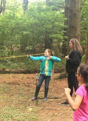 Anya Boguscki, a member of Girl Scout Troop 6242, which meets at St. John's United Church of Christ, Mickleys, Whitehall, takes her turn with a bow and arrow during a trip to Mountain House, a camp location for Girl Scouts in Salisbury Township, Sept. 14. Also pictured is archery instructor Crystal Horvath, of Whitehall.