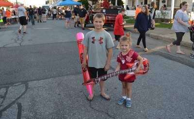 Press photos by Al ReckerDustin Drukenmiller and Makinley Szoke show their game prizes - an oversized crayon and an inflatable guitar - during Northampton Fire Department's second annual block party, held Sept. 21 at Alliance Fire Company, Washington Avenue.