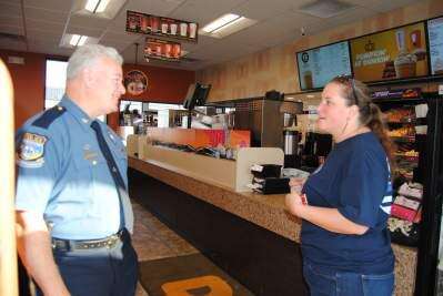 Upper Macungie Township Police Chief Edgardo Colón talks with Erin Kennybrew of Breinigsville while she waits for her order at Dunkin', Fogelsville. Members of the department visited with customers Oct. 2 during Coffee with a Cop.