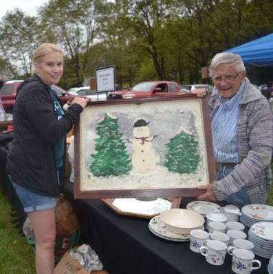 Christine Snyder, of Northampton, has her eyes set on a framed winter scene of a snowman and trees during Whitehall Historical Preservation Society's yard sale, set Sept. 14 by the barn on the Peter Grim Homestead, 1111 Lehnert Road, Whitehall. Robert Miller, former vice president of WHPS, assists.PRESS PHOTO BY AL RECKER