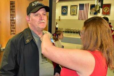 PRESS PHOTOS BY DANA GRUBBPTO member Carolann Phalen pins a carnation retired U.S. Army (ret.) Master Sergeant Joe Soska, a Bethlehem Township resident. Soska served from 1981 to 2011.