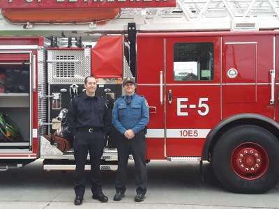 press photos by.... EMT Bryan Nelson and Firefighter Brett Knerr pose before the new engine.