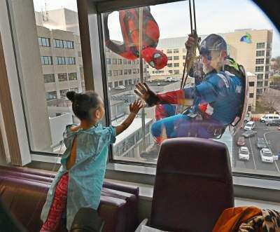 Press photos by Jim MarshYoungsters receiving care in the pediatric unit of Lehigh Valley Reilly Children's Hospital on the Cedar Crest campus of Lehigh Valley Hospital had a rare treat Nov. 14 when window cleaners dressed in superhero costumes appeared outside the windows of their hospital rooms. Mya Nelson, of Allentown, links hands through the window as Spider-Man and Captain America stop