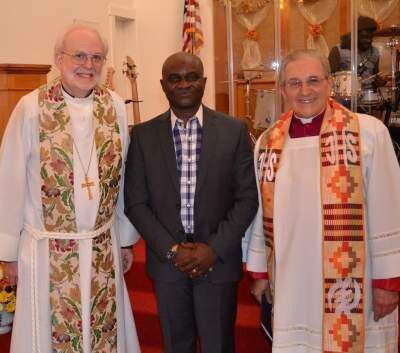 PRESS PHOTO BY AL RECKERFrom left, the Rev. Timothy Boyer, St. John's Lutheran Church; Pastor Bola Akomolede, Redeemed Christian Church of God; and Mgsr. John Martin, St. Peter Roman Catholic Church, all in Coplay, lead the 53rd annual Coplay community Thanksgiving service, held Nov. 24 at Redeemed Christian Church of God. A full buffet was prepared for the worshippers in the fellowship hall