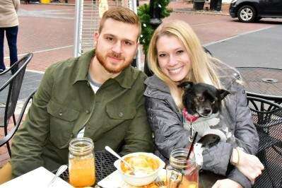 Coco, a 6-year-old Jack Russell Chihuahua, is snuggled against Kassidy Taylor on a nippy Nov. 23 as Taylor and Ian Ellwood dine al fresco at Tapas on Main in downtown Bethlehem. Taylor was visiting Ellwood from Richmond, Va. and it was Coco's first visit to Bethlehem. Their next stop after lunch was Christkindlmarkt.press photo by dana grubb