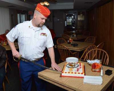 Ninety-one-year-old Charles W. Helfrich, proudly wearing a distinctive red garrison cap with his detachment affiliation, a red wool jacket emblazoned with the words, “Marine Corps,” attended. Speaking in a strong voice, Helfrich reminded the attendees that he too had been born on Nov. 10.