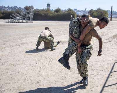 PRESS PHOTO COURTESY NAVY Mass Communication Specialist 3rd Class Cosmo WalrathFire Controlman 2nd Class Franklin Martinez from Allentown carries Operations Specialist Seaman Tavian Murray of New Bern, N.C., during an introductory Marine Corps Martial Arts Program course on Marine Corps Recruit Depot. Both are assigned to the amphibious assault ship USS Bonhomme Richard (LHD 6).