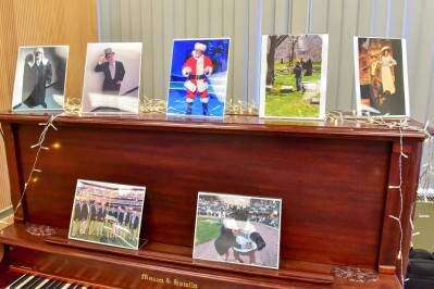 Photos of Bob Cohen in various capacities adorned a piano in the Bob Cohen room.