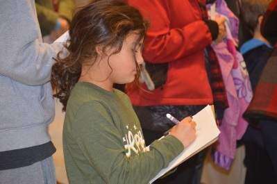 More than 400 parents, grandparents, teachers, children and fans attended the event. After brief introductions by Kirsten Hess of Let’s Play Books! and Collage representatives Hailey Jack and Ivory Gao, Brett began the presentation. She related her experiences in India, where she studied the flora, architecture and fauna that became the focus of the book’s intricate illustrations.