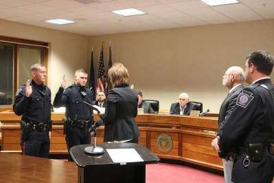 Families of both officers were in attendance. In a speech before the swearing in, Marks said those families could now depend on the police department for support, in good times and bad.